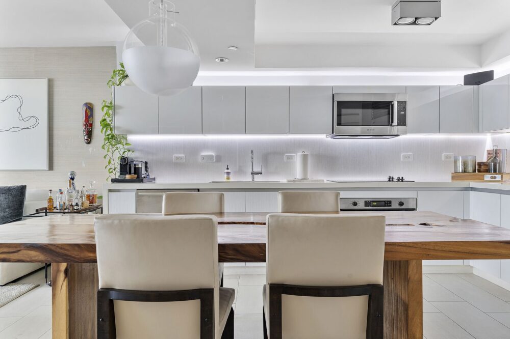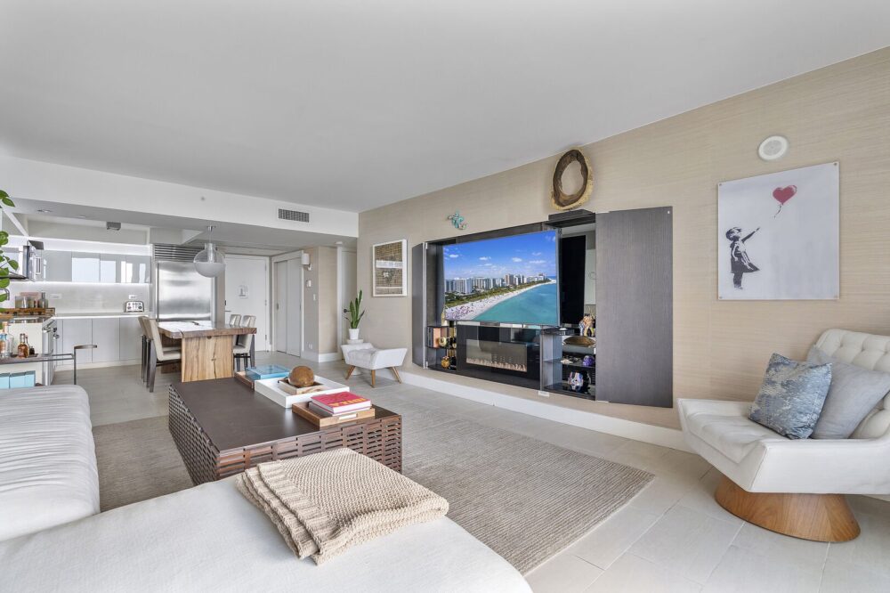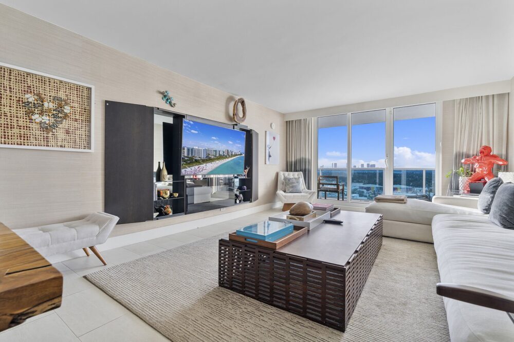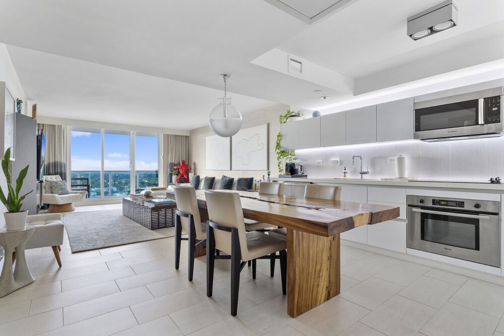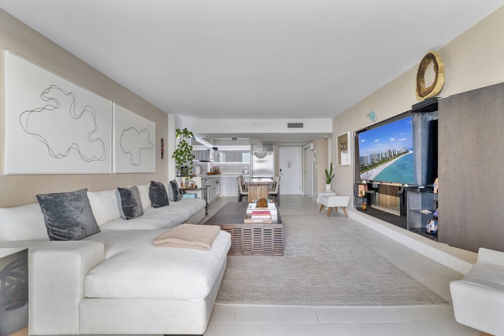 - Living Room: Plush organic white sofa, open dining area, and access to a private furnished balcony overlooking the skyline and Intracoastal.