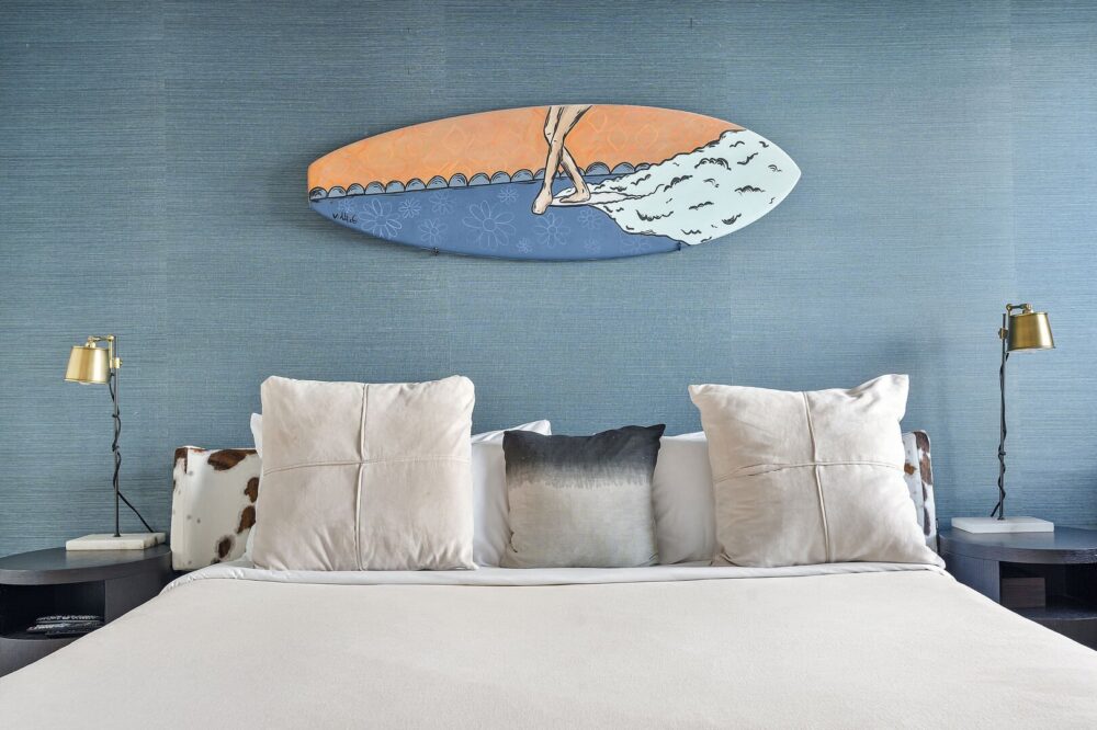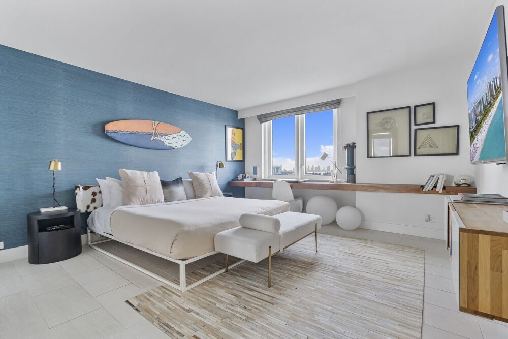 The living room features a plush white organic sofa, creating an inviting space to unwind after a day in the sun. The master bedroom serves as a serene retreat, furnished with a king bed, luxurious organic mattress, and 100% organic cotton linens. A nine-foot maple writing desk adds both function and sophistication, ideal for working or journaling while surrounded by panoramic city views.